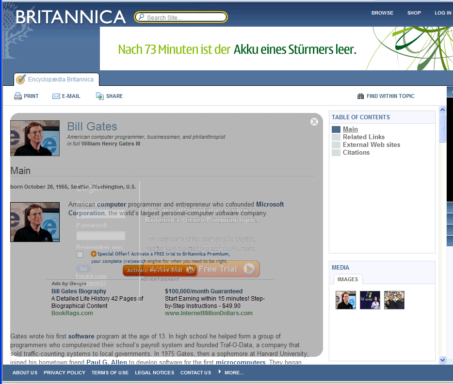 Wer sich als mein Gast (und Werbeträger) auf einen Link zur Encyclopaedia Britannica einläßt und sich dann dort für die kostenlosen 7 Tage registrieren möchte, der merkt schon auf der 2. Seite das Haar in der Suppe.